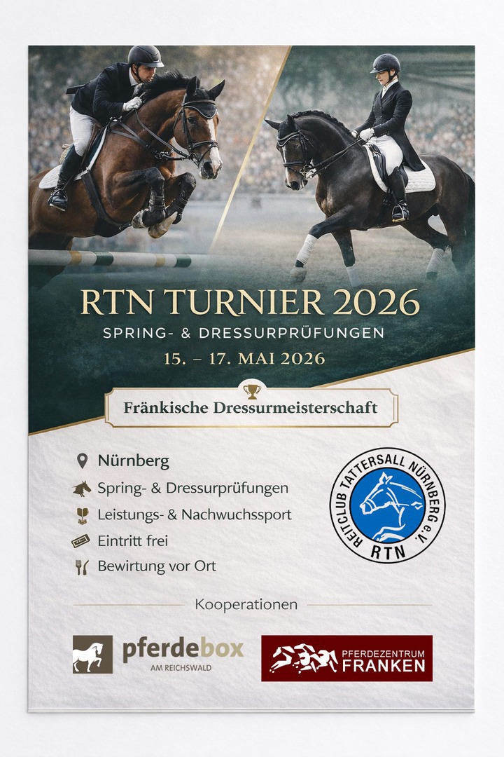 Am 15.05. - 17.05.2026 veranstalten wir unser Dressur- und Springturnier inklusive der Fränkischen Dressurmeisterschaft und freuen uns auf alle Teilnehmer, Besucher und Zuschauer.